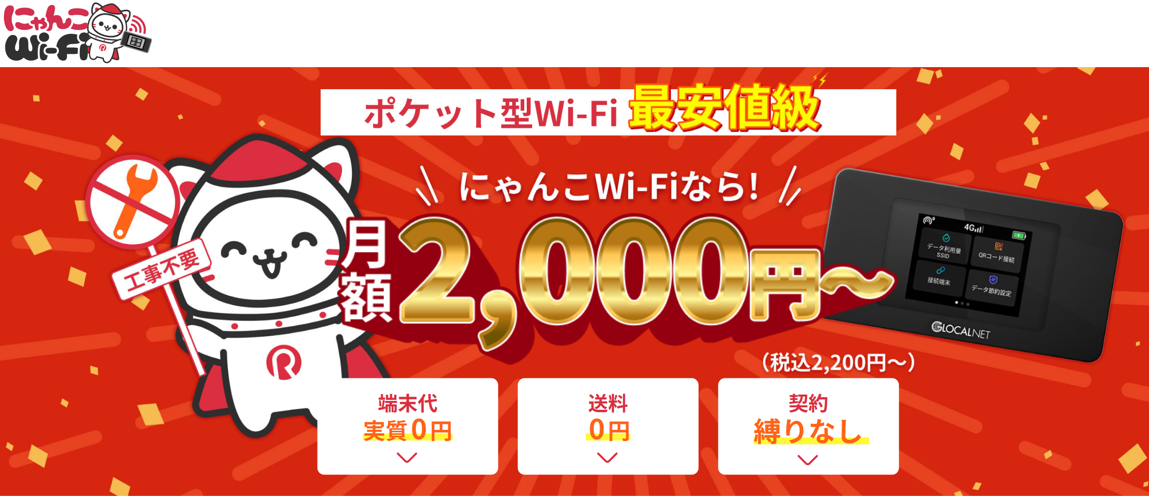 - 月額料金:にゃんこWi-Fiは月2,000円台からと比較的安価なゾーン
