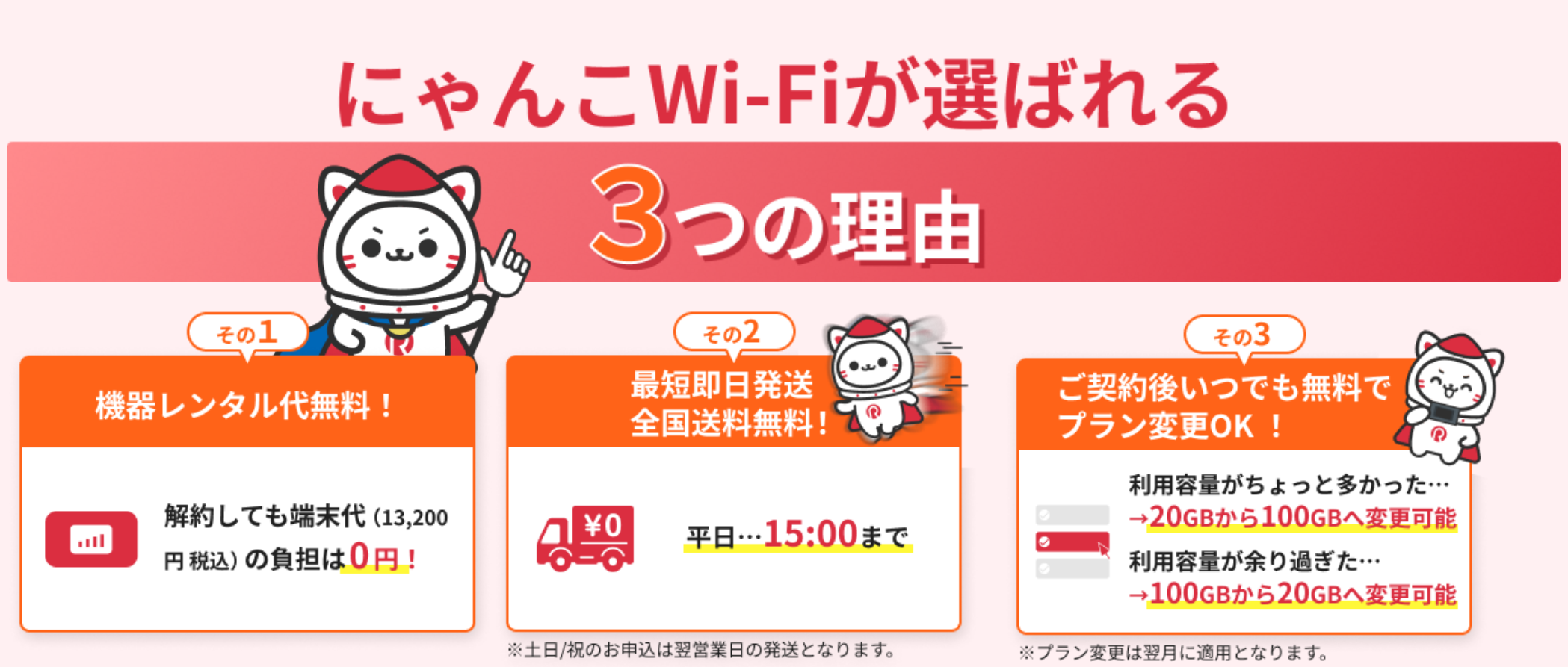 他社の中には「3年縛り+高額な解約金」というケースもあり、短期利用や“とりあえず試したい”人にはハードルになる場合があります。その点、にゃんこWi-Fiは、「縛りありで最安を狙う」「縛りなしでリスクを減らす」のどちらも選べるバランス型。料金とリスクのバランスが取りやすいのが強みです。